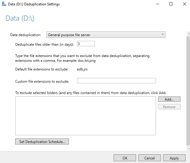 Enable-DedupVolume -Volume D: -UsageType [Default|Hyper-V|Backup]